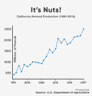 For each of these trends, nutritious almonds—portable, crunchable, and mild-tasting—fit the bill perfectly. They’re so perfect, in fact, that California’s almond crops are breaking records and causing agricultural “ripple effects” across the globe.