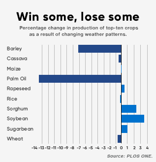 A closer look at individual crops in specific regions tells a story that may help some areas. Climate change is reducing wheat yields by 0.9 percent each year but is increasing yields of drought-tolerant sorghum by 0.7–0.9 percent. Growing alternative crops like sorghum that can thrive in changed conditions may be one way of helping regions that are hit hardest by changed weather patterns.