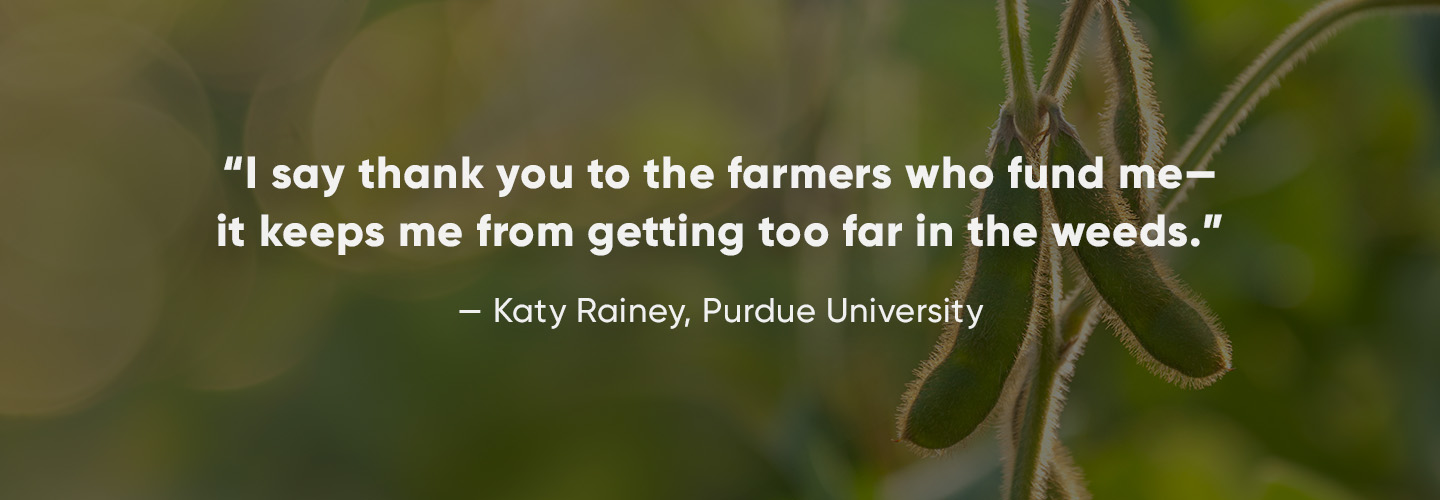 Rainey’s work is part of a program funded by the United Soybean Board (USB). This nationwide organization awards research grants each year based on the needs and priorities of the farmers who fund USB through a self-imposed tax. Rainey believes this funding process has a positive influence on her field. “I like doing things that are tangibly valuable,” she notes. “And when you don’t have science funded competitively, people can be less prone to evaluate why they’re doing what they’re doing. I say thank you to the farmers who fund me—it keeps me from getting too far in the weeds.“